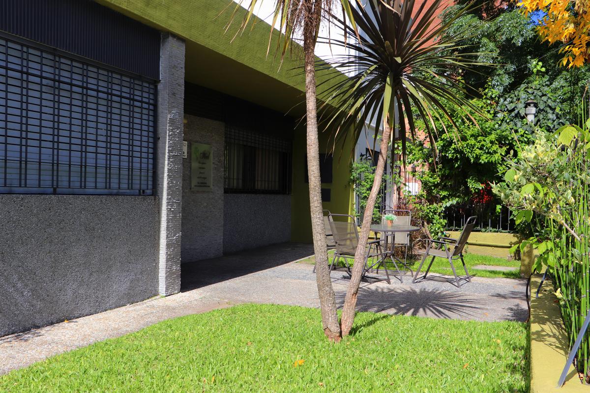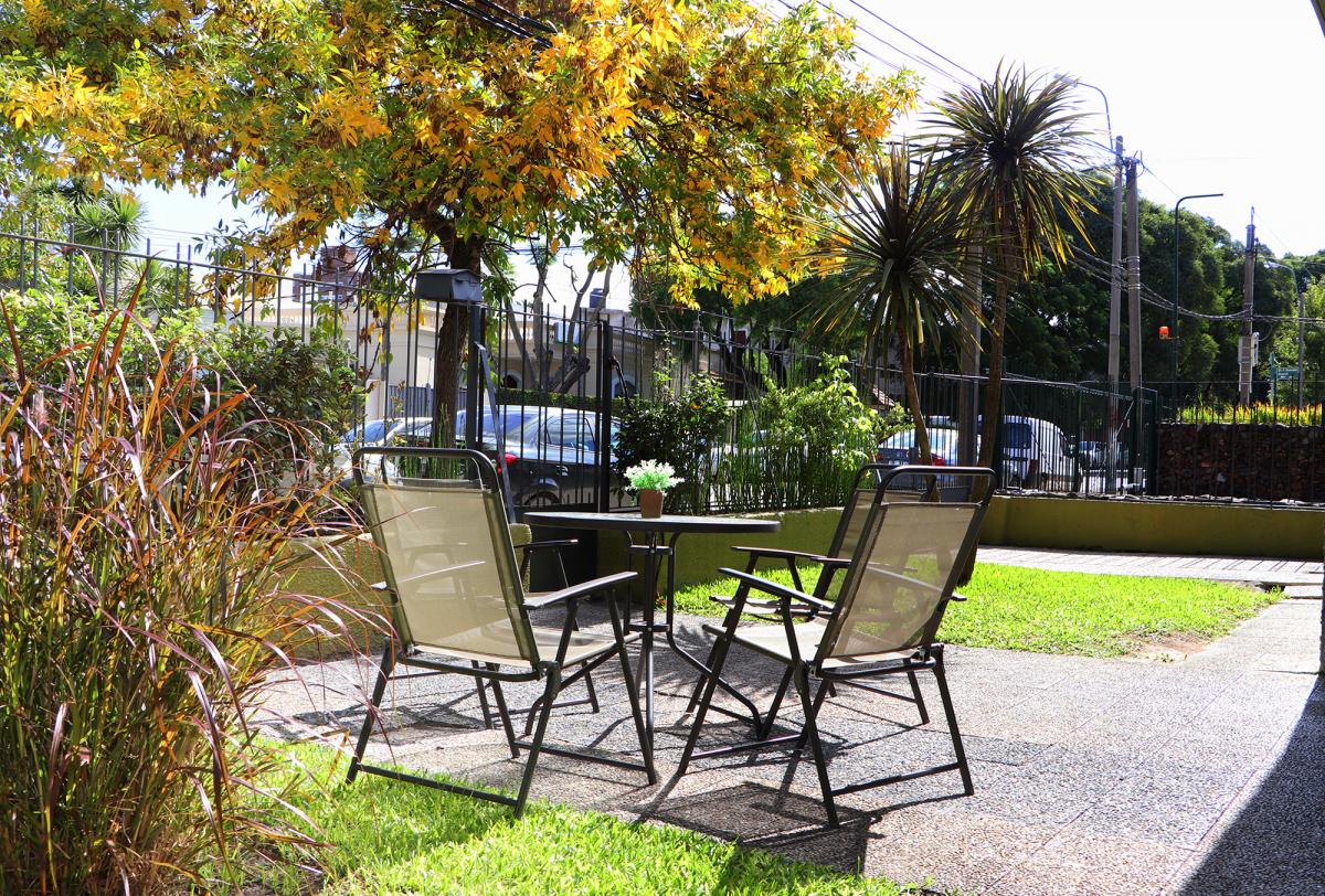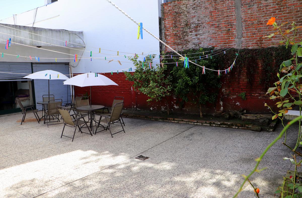 - Jardín al fondo con parrillero y mesas con sombrillas